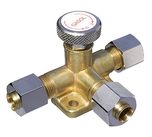 Avstängningsventil med snabbavstängning till gasolanläggningar. T-rörs anslutning 8 mm i alla ändarna, koppling mutter och skärring. Ventilen stäng...